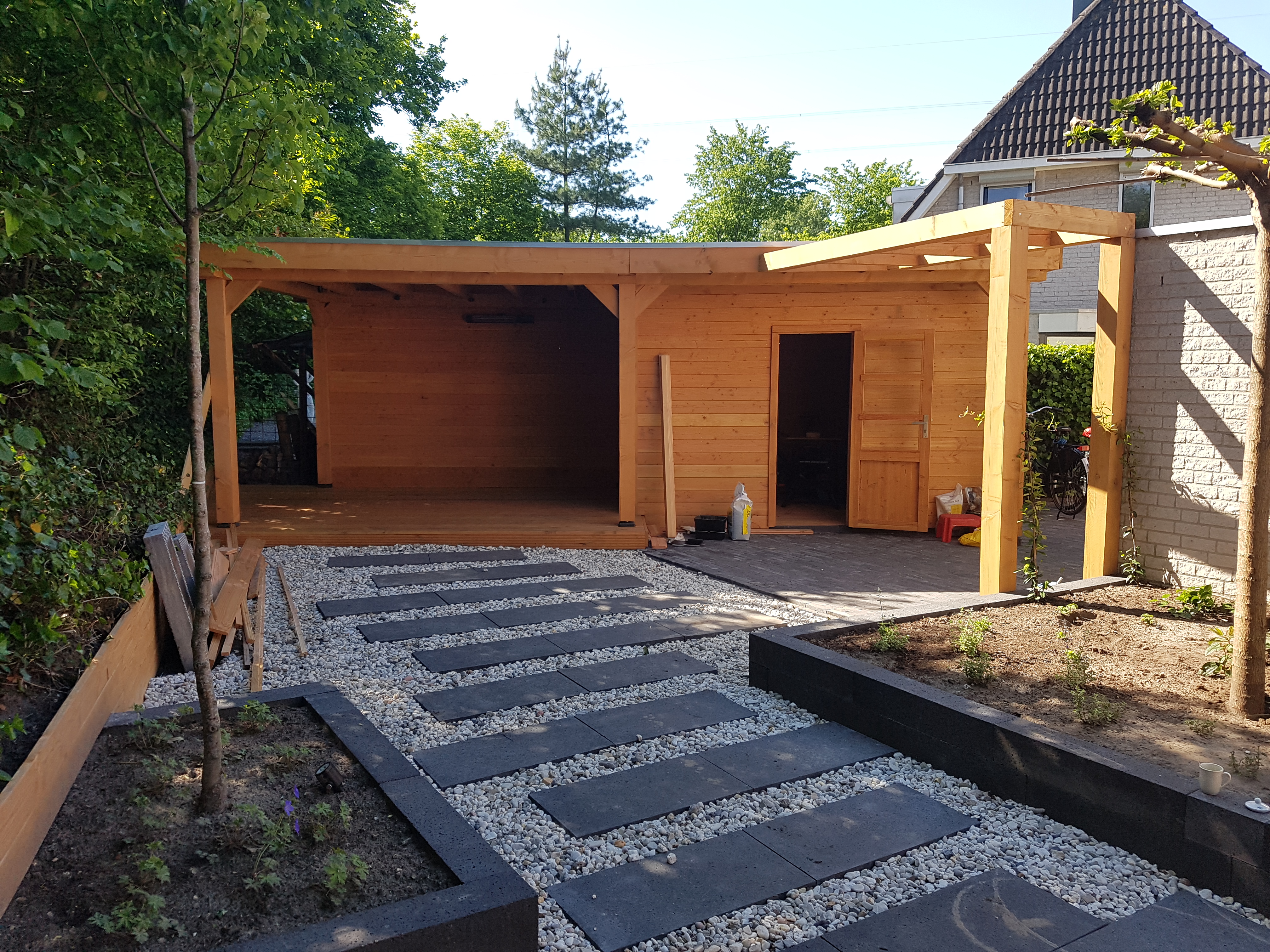een douglas overkaping met een schuur . verder de rest van de tuin aangelegd met schellevis tegels en split